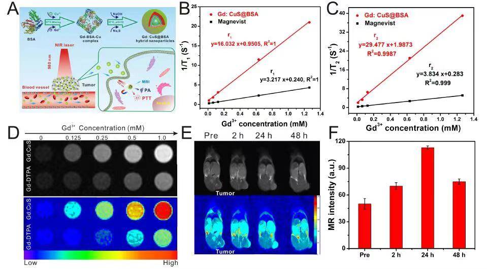 (A) Schematic of Gd:CuS nanoparticle synthesis; (B) longitudinal relaxation curve; (C) transverse relaxation curve; (D) in vitro T1-weighted imaging; (E) in vivo T1-weighted imaging; (F) signal intensity values.