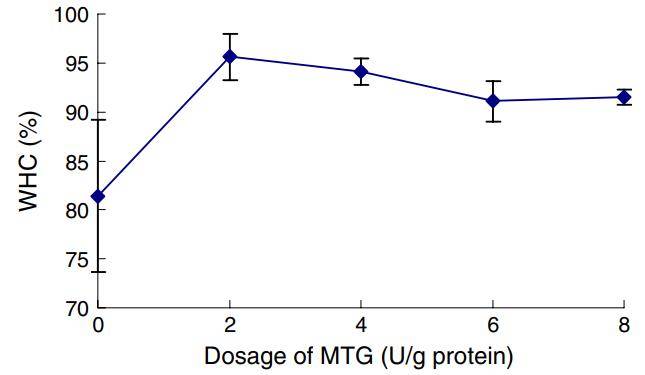 Gelation combined with enzymatic crosslinking causes myofibrillar protein chains to bind, forming a continuous three-dimensional network in which water is entrapped. WHC reflects the protein’s ability to retain water and is widely used as an objective indicator of meat quality and yield. As shown below, increasing MTG from 0 to 2 U/g protein significantly raised the WHC of PMP gels from 81.4% to 95.6%. Beyond 2 U/g, up to 8 U/g protein, WHC did not increase further.