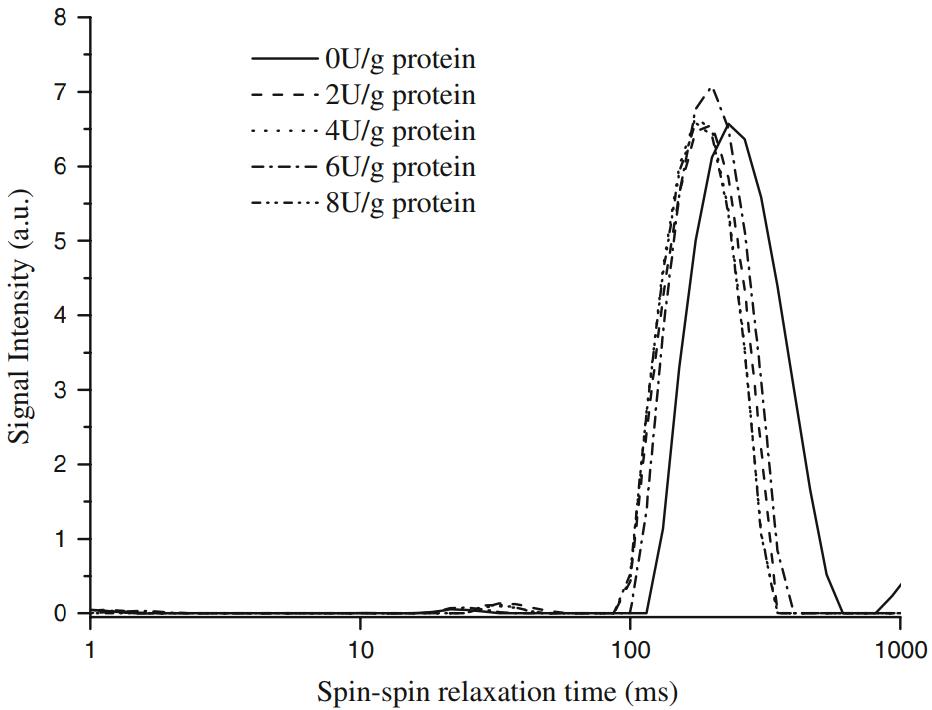 After enzyme addition, significant shifts in T2 relaxation times were observed. T2 decreased from 226 ms in the control group to 188 ms at 2 U/g protein. However, further increases in enzyme concentration up to 8 U/g protein produced no additional reduction.