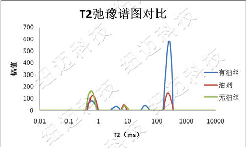 In the T2 spectra of oil-containing, oil-free, and pure oil samples, both fiber and oil signals are visible. The most significant difference appears after 7ms—these later peaks are defined as the oil signal. Peaks before 7ms represent fiber and tube signals. Special NMR sequences can be used to isolate pure oil signals at specific echo times. Therefore, the second echo peak is selected as the oil signal source.