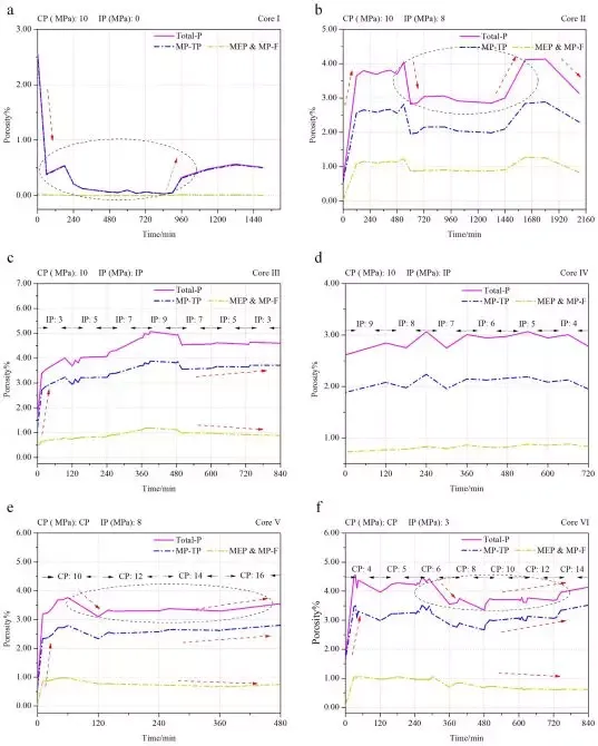 With constant injection pressure and varying confining pressure, total porosity increases during injection. Under constant or rising confining pressure, total porosity first decreases then increases. Mesopores and macropores-fractures decrease, while micropores-transition pores increase. Figure 5e shows a 79.9% increase in total porosity during the first 10 minutes; when confining pressure rose from 10 to 12 MPa, total porosity decreased by 17.5%. Overall, total porosity and micropores-transition pores rise with confining pressure, while mesopores and macropores-fractures decline. Figure 5f shows total porosity increased by 62.7% in the first 30 minutes, then decreased by 17% as confining pressure increased from 6 to 8 MPa.