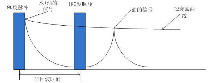 After a half-echo delay time (τ), the magnetization M becomes: Poil × (−e−τ/T2oil) + Pwater × (−e−τ/T2water)