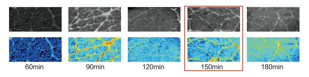 In T1-weighted images, the net-like structure represents intramuscular fat, while darker regions reflect muscle tissue. As braising time increases, fat begins to dissolve, making the fat-rich areas appear brighter. Eventually, fat is rendered and replaced by water, brightening the overall image and blurring the net-like texture.