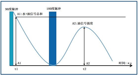 The measurement is conducted using a spin echo sequence. As illustrated below, a Free Induction Decay (FID) signal is recorded at time t1 after the 90° RF pulse, resulting in signal amplitude A1—representing the combined signal of oil and moisture. Following the 180° pulse, the spin echo signal amplitude A2 is measured; by this point, the water signal has decayed completely, leaving only the oil signal. Oil content can then be quantified based on the correlation between signal strength and hydrogen proton concentration.