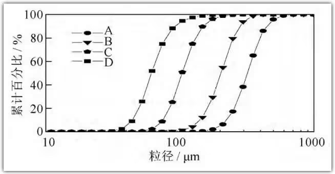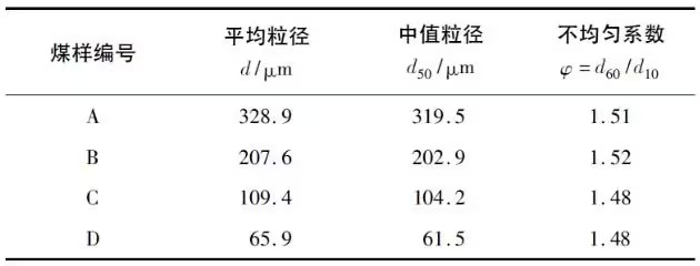 Coal powder was used as the raw material and sieved through 50, 70, 100, 200, and 270 mesh screens to obtain samples. After washing, sieving, and drying, four types of coal powder with relatively uniform particle size were obtained, labelled A, B, C, and D. Their particle size distributions are shown in Figure 1, while particle sizes and uniformity coefficients are shown in Figure 2.