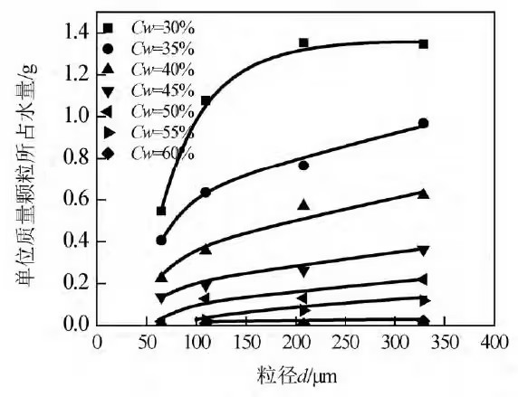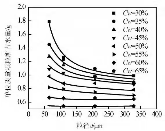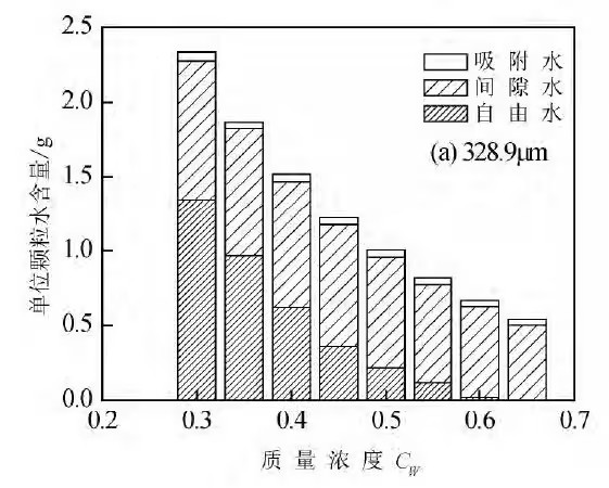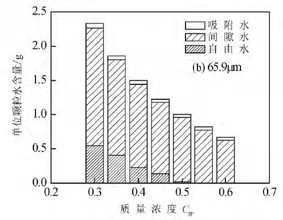 2) At a fixed particle size, adsorbed water remains unaffected by concentration, interstitial water increases with concentration, and free water decreases. At a fixed concentration, adsorbed and interstitial water decrease with increasing particle size, while free water increases.