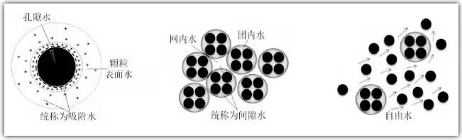 Coal-water slurries contain three types of water: adsorbed water on particle surfaces, interstitial water between particles, and free water. Due to their differing physicochemical states, their mobility varies significantly. This is illustrated in Figure 4.