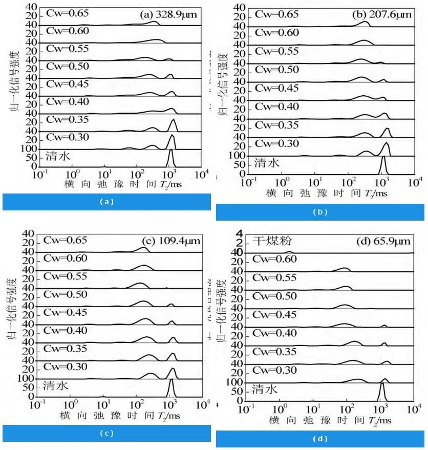 Relaxation signals from NMR inversion for coal-water slurries of various concentrations and particle sizes are shown in Figure 3.