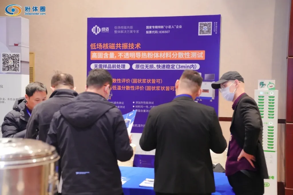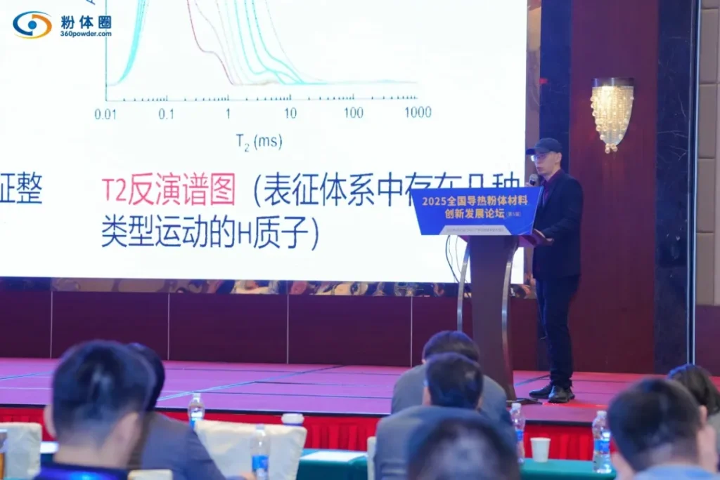 At the forum, the Niumag product manager presented the application of Low-Field Nuclear Magnetic Resonance (LF-NMR) technology in powder materials, explaining how the analysis of hydrogen proton relaxation times can reveal the motion state of particles. He highlighted the technology’s advantages in assessing powder dispersibility in high solid-content thermal materials—such as no sample pre-treatment, in-situ non-destructive testing, and rapid, stable results. Several application cases were shared, including lithium battery thermal slurries, ink dispersibility evaluation, and elastomer crosslink density measurement.