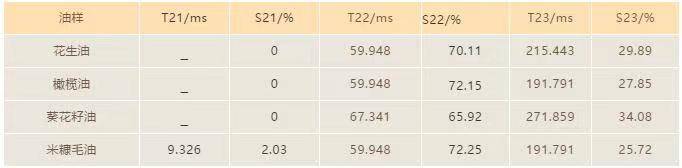 2. The T21 peak near 10 ms is also present in other low-quality oils (e.g., other crude oils, frying oils, rancid fats), suggesting this method can be broadly applied to initial screening of edible oil adulteration.