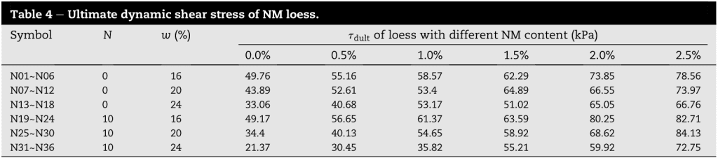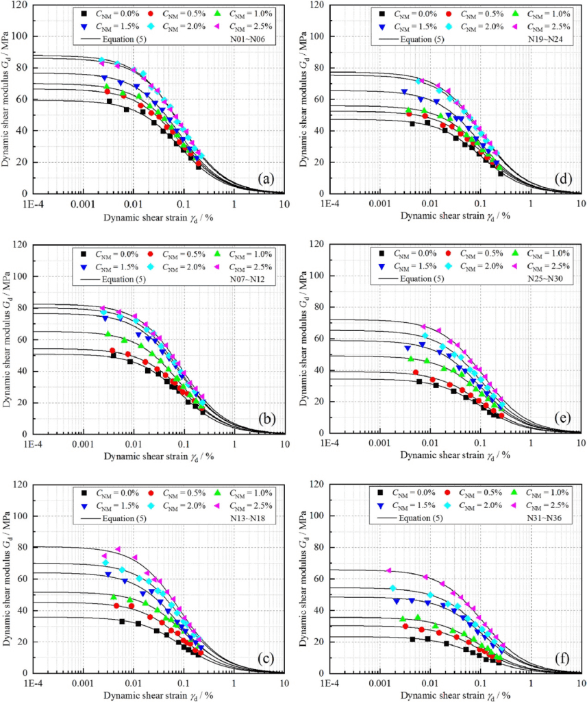 Figure 2 shows the dynamic shear strain–stress curves for samples with 0% to 2.5% NM, before and after F-T cycles. All samples exhibited strain-hardening behaviour and conformed to the Hardin model. Notably, the curves shifted upward with increasing NM content, indicating higher shear stress at equivalent strain levels.