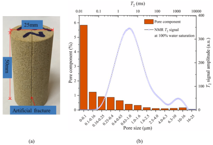 Figure 1 shows the original rock sample, an artificially induced fracture for slurry injection, and the pore size distribution derived from NMR measurements.