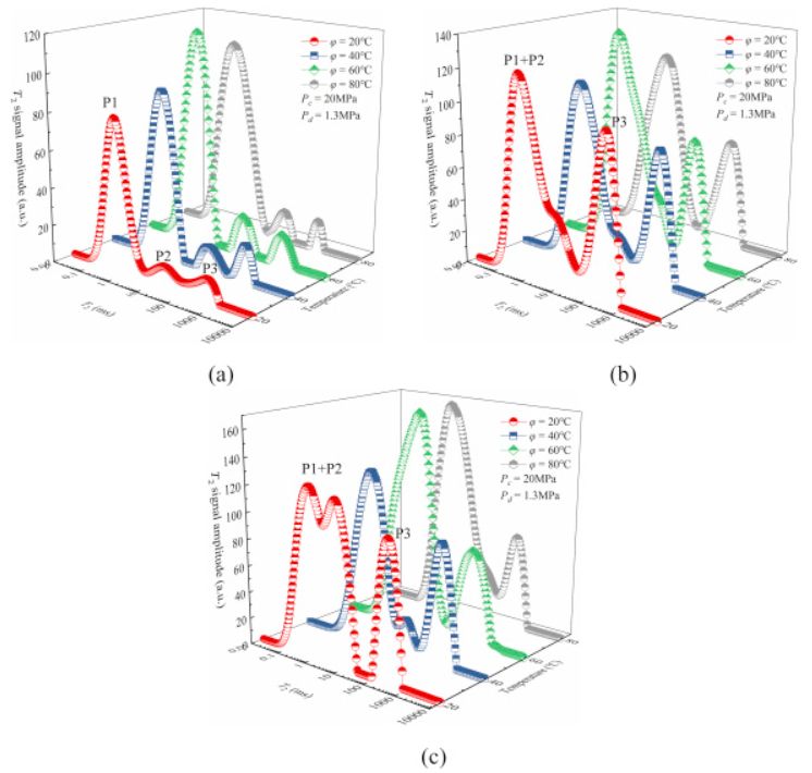 Initially, the relaxation distribution under different temperatures shows three peaks (Figure 3a). As grouting continues, T2 evolves (Figures 3b and 3c). As injection time increases from t = 30s to 60s, the second peak merges with the first, resulting in a bimodal distribution. The new first peak (P1+P2) and second peak (P3) are now in the ranges of 0.1 ms–100 ms and 100 ms–1000 ms, respectively. With increased injection time, both new peaks (P1+P2 and P3) grow, showing that grout penetrates micro- and macro-pores and fractures simultaneously. Moreover, as temperature increases from 20°C to 80°C, the area under P3 at t = 30s decreases, indicating reduced grout mobility in fractures at higher temperatures. In Figure 3c, as time increases from t = 30s to 60s, P3 remains largely unchanged while P1+P2 increases significantly, suggesting that at this stage, grout mainly moves into smaller pores rather than fractures.