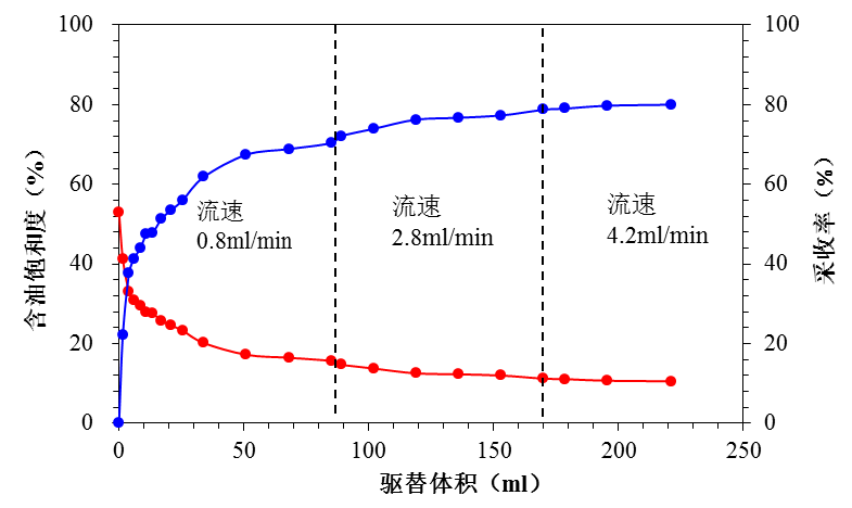 A second rate increase (from 2.8 ml/min to 4.2 ml/min) still provided benefits, but the curve flattened, and oil saturation changed only slightly.