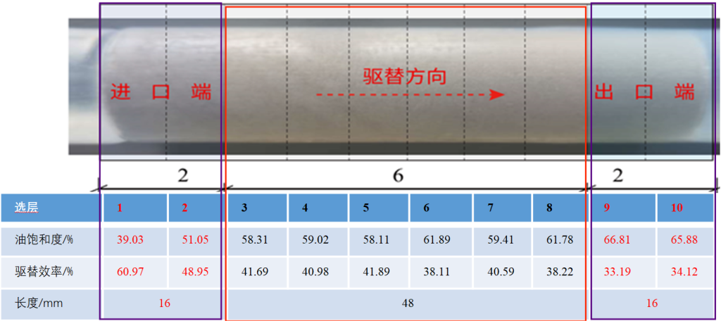 As shown above, the constant-gradient layered technique was used to evaluate the displacement efficiency of each core layer. The purple regions at both ends indicate end-face effects, while the central red region represents the effective displacement segment with end-face effects removed. The overall displacement efficiency was 41.87%, while the displacement efficiency after eliminating end-face effects using the constant-gradient selective-layer technique was 40.25%.