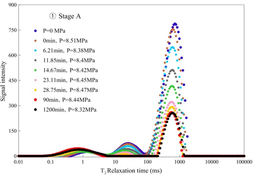 According to Figure 2, pore water is classified into three types: small pores (T2<9 ms), medium pores (9 ms<T2<100 ms), and large pores (T2>100 ms). Freezing begins in large pores and gradually progresses to smaller pores.