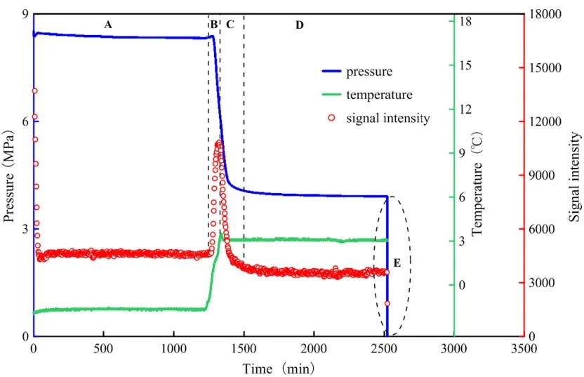 When the pressure gauge indicated a drop in pressure, methane hydrate formation had begun, and the temperature was maintained at this level. The NMR signal stopped rising and gradually decreased. Finally, the pressure reached a lower stable value, and the NMR signal also stabilised, marking the completion of methane hydrate formation.