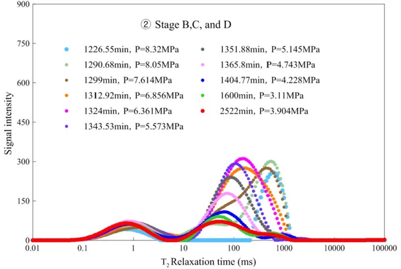 Figure 3: T2 relaxation time distribution during stages B, C, and D of hydrate formation