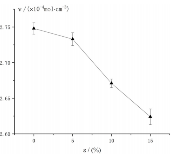 As shown in Figure 1, the crosslink density of the HTPB coating decreases with increasing strain. This is mainly due to the unfolding and reorientation of polymer chains under stress, which reduces entanglement and increases chain spacing. The number of available alignment directions increases along the direction of applied force. Additionally, high strain may induce physical damage to the polymer network, further contributing to reduced crosslink density.
