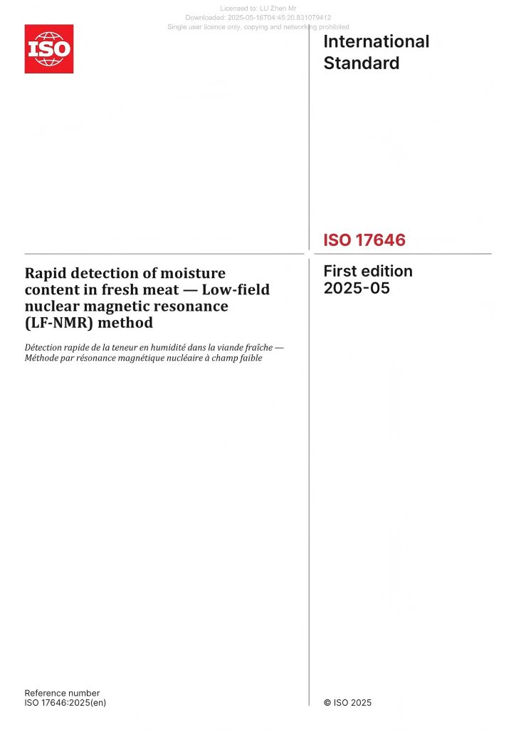 The global food testing industry has reached a major technological milestone — the International Organization for Standardization (ISO) has officially adopted and published the first international standard using low-field Nuclear Magnetic Resonance (LF-NMR) technology to determine meat moisture content (ISO 17646:2025 “Rapid Determination of Moisture Content in Fresh Meat — Low-Field Nuclear Magnetic Resonance Method”). This groundbreaking achievement was led by a team of Chinese food science experts, marking China’s entry into the forefront of global food quality and safety testing technologies.