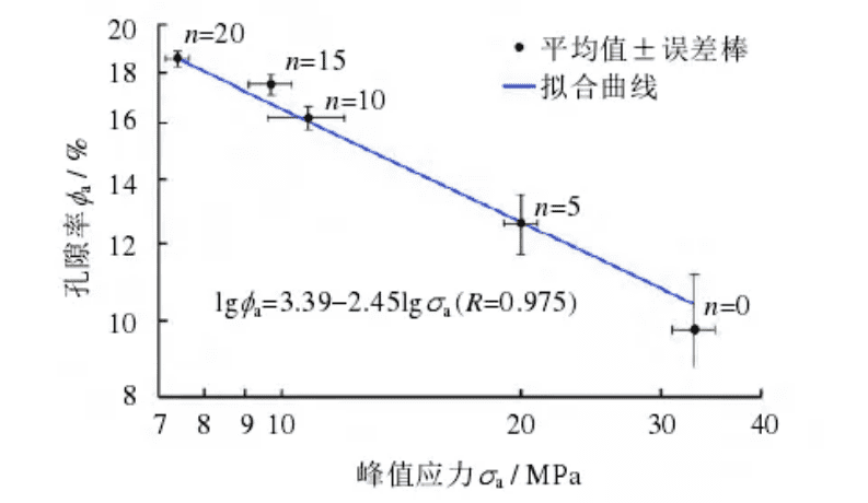 Figure 9. Relationship between peak stress and porosity