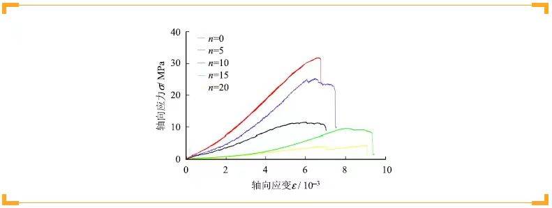 Figure 7 illustrates the uniaxial compressive stress–strain curves after different wetting–drying cycles. In the pre-peak stage, mechanical behavior remains similar across cycles. However, post-peak characteristics vary significantly. Samples subjected to fewer cycles display long elastic stages, higher elastic moduli, and shorter plastic phases—typical brittle failure. With more cycles, the elastic modulus decreases, indicating a transition from brittleness to ductility. Even after reaching peak stress, samples retain residual strength, with ductile behavior becoming increasingly prominent.