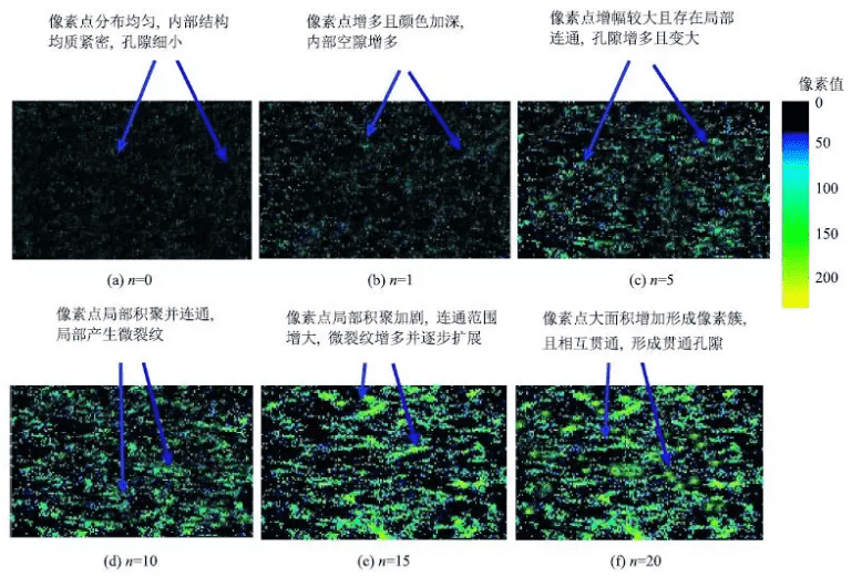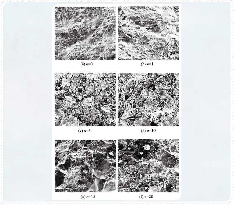 As the number of cycles increases, internal pores enlarge and interconnect, forming microcracks that propagate. The changes observed in MRI scans correspond closely with those seen in SEM images under the same conditions (Figure 5).