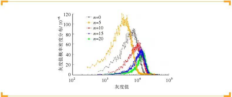 In NMR imaging, grayscale values integrate parameters like spin density, T1, and T2 relaxation times as spatial functions. Spatial data is encoded and arranged into a matrix, and 2D Fourier transformation provides a signal intensity map of internal structures. Figure 6 shows grayscale probability density functions of MRI images across cycles. As water–rock interactions intensify, the proportion of high grayscale values increases, indicating structural degradation. The shift in grayscale distribution reveals the degree of internal transformation—the convergence of mean values signals diminishing structural uniformity.