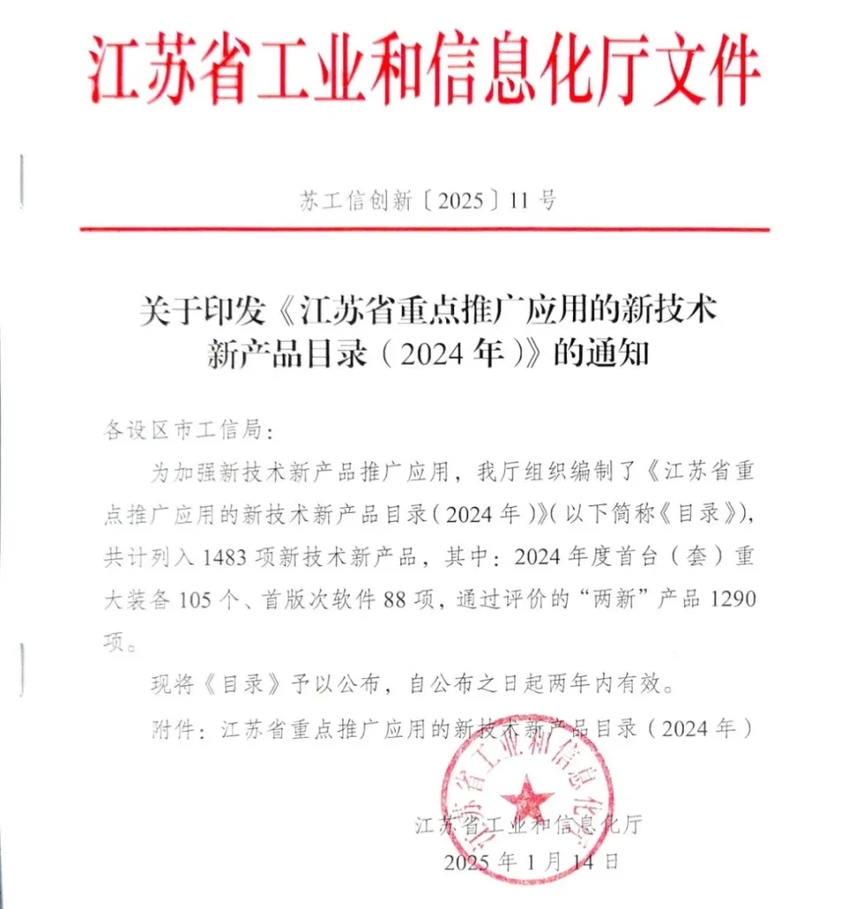 The “Catalogue of Key New Technologies and Products for Promotion and Application in Jiangsu Province” was compiled by the Jiangsu Provincial Department of Industry and Information Technology. It focuses on selecting technologies and products with high originality, advanced technology, clear intellectual property, reliable quality, and broad market prospects within Jiangsu Province and aims to promote the application and implementation of new technologies and products, as well as facilitate the transformation and industrialization of scientific and technological achievements.