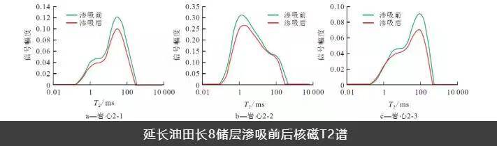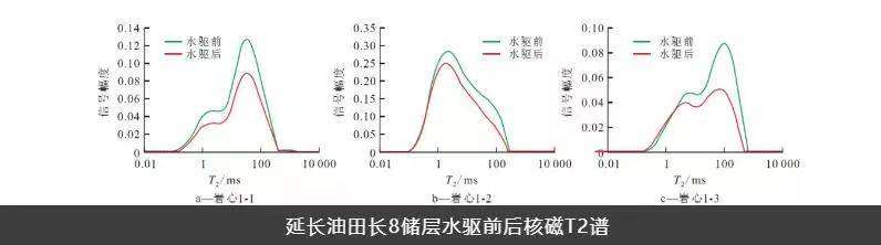 From the NMR T₂ spectra of Chang-8 core samples before and after displacement, it is evident that during water flooding, the decrease in oil reduces the oil-phase relaxation signal. The amplitudes of both left and right T₂ peaks decrease, with the right peak reducing more significantly. This indicates that injected water primarily displaces oil in large and medium pores. Residual oil has a relaxation time below 100 ms and a higher peak, suggesting that most displaced oil comes from large pores, while residual oil mainly resides in medium-to-small pores.