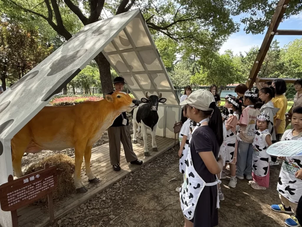 At the start of the event, the children, like cheerful little deer, arrived at the “eco-simulated farm” filled with a pastoral atmosphere. There, they opened their curious eyes, carefully listening to the staff explaining the different breeds of cows, learning about the habits of these “milk-producing champions.” Watching the simulated cows and listening to their stories, the children gained a more intuitive understanding of where milk comes from, their little heads filled with new knowledge.