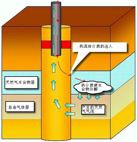 Thermal stimulation involves injecting hot water under constant pressure, raising the system temperature to the decomposition threshold. This approach is costly and requires simultaneous downward heating and upward gas production.