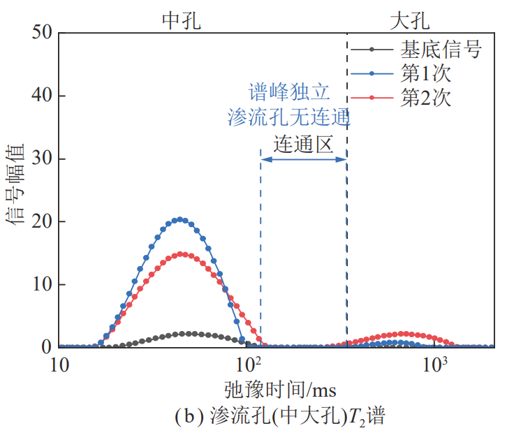 Through nuclear magnetic resonance testing of the coal samples subjected to vibration loads, the evolution characteristics of the pore fractures were analyzed. According to the T2 spectrum pore classification method, coal sample pores are divided into micropores (T2<3.33ms), mesopores (3.33ms≤T2<344ms), and macropores (344ms≤T2). Micropores are also called adsorption pores, while meso and macropores are collectively referred to as seepage pores. Based on the positions of the peaks in the T2 spectra, the evolution process of the coal pore structure under multiple vibration load impacts can be divided into four stages.