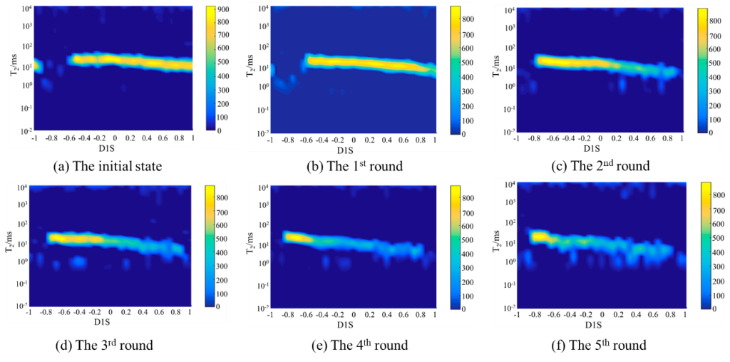 (4) Use an online high-temperature high-pressure CO2 displacement setup to quantitatively calculate dynamic recovery rates. Additionally, two-dimensional T1-T2 maps have unique advantages in identifying various fluid types and in-situ fluid content in shale oil layers under different reservoir conditions. During CO2 enhanced recovery in shale oil reservoirs, MRI technology has immense potential for characterizing the gas-liquid interface spatial distribution. Layered T2 technology provides spatially resolved T2 distributions of samples during CO2 flooding processes and gas-liquid interface distributions.