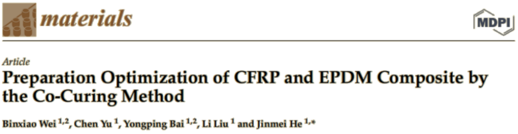 This study primarily focuses on further optimizing the performance of solid rocket motor (SRM) casings under increasingly stringent aerospace technology requirements. The research used the co-curing technique to prepare carbon fiber reinforced polymer (CFRP) and ethylene propylene diene monomer (EPDM) rubber composites. By varying the temperature, heating time, and the type of curing agent, the properties of the CFRP/EPDM composite were adjusted to achieve the best manufacturing process. The crosslinking density tested by nuclear magnetic resonance (NMR) was 3.459 × 10-4 mol/cm3, with a 90° peel strength of 2.342 N/mm and interlaminar shear strength (ILSS) of 82.08 MPa. These results indicate that heating for 20 minutes at 160°C using a DCP/S vulcanization system yields the best mechanical properties of the composite.