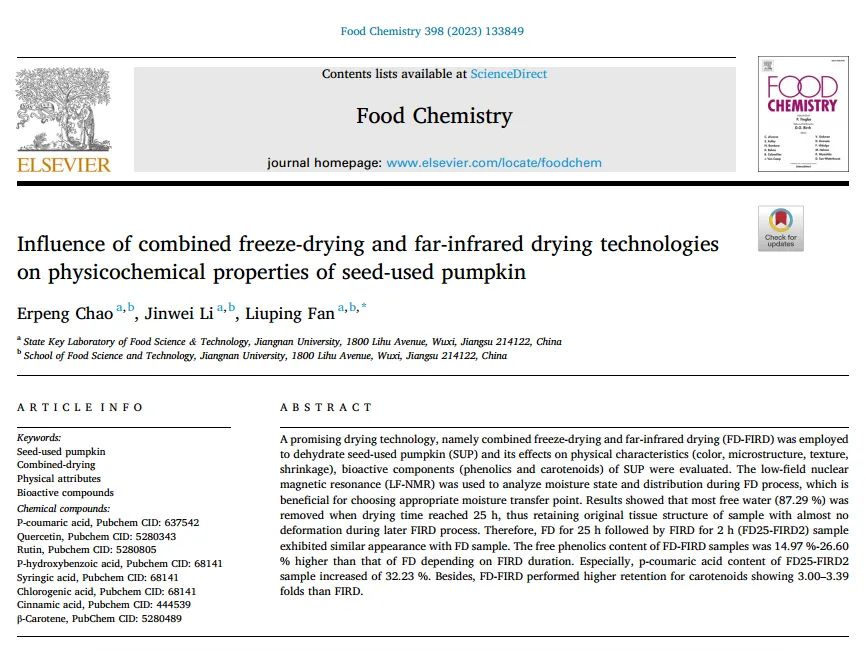 Researchers have adopted a promising drying technique, a combination of freeze-drying and far-infrared drying (FD-FIRD), to dehydrate seed pumpkin (SUP) and evaluated its effects on the physical properties (color, microstructure, texture, shrinkage rate) and bioactive components (phenolics and carotenoids) of the pumpkin. Low-field nuclear magnetic resonance (LF-NMR) was used to analyze the moisture state and distribution during the molding process, which helped to select the appropriate moisture transfer point. Results show that after 25 hours of drying, most of the free water (87.29%) was removed, preserving the sample’s original tissue structure, and minimal deformation occurred during the subsequent heat curing defatting process. Therefore, the sample dried for 25 hours followed by 2 hours of heat curing defatting (FD25-FIRD2) resembled the appearance of the dried defatted sample. FD-FIRD samples had 14.97%–26.60% higher free phenol content than FD samples, depending on the duration of FIRD. In particular, the coumaric acid content in the FD25-FIRD2 sample increased by 32.23%. Additionally, the carotenoid retention in FD-FIRD was 3.00-3.39 times higher than that in FIRD.