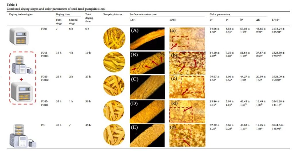 Table 1. Comprehensive drying stages and color parameters of seed pumpkin slices