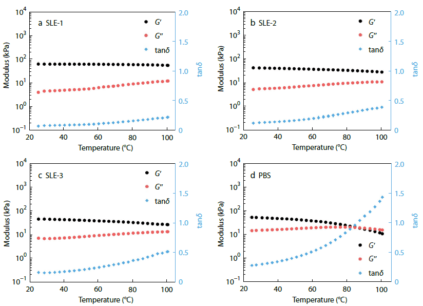 Rheological experiments were also conducted to study the viscoelastic properties of SLE. Rheology remains a classical approach for probing chain dynamics. In the tested temperature range, the storage modulus (G’) exceeded the loss modulus (G”), suggesting good thermal stability. However, a slight decrease in G’ at high temperatures may be attributed to rapid dissociation of boron–oxygen coordination bonds.
