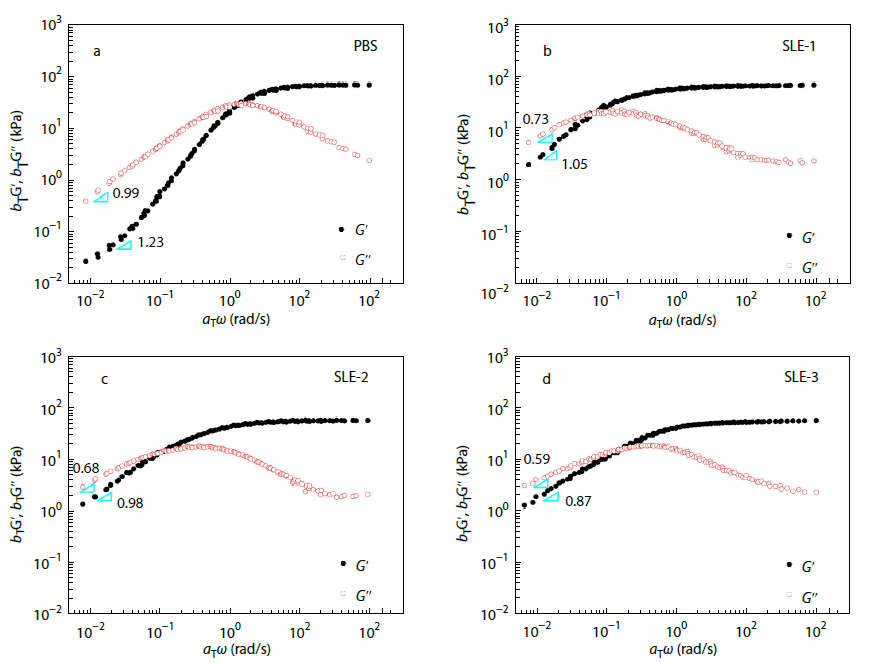 To further explore the impact of dynamic bonds on linear viscoelasticity, the authors conducted small-amplitude oscillatory shear tests and applied time–temperature superposition to generate master curves from dynamic moduli measured at various temperatures. As shown below, both storage and loss moduli displayed sub-Maxwellian slopes at the high-frequency end, indicating dynamic heterogeneity. The plateau modulus decreased with increasing PBS content, suggesting lower crosslink density—consistent with MQ NMR observations.