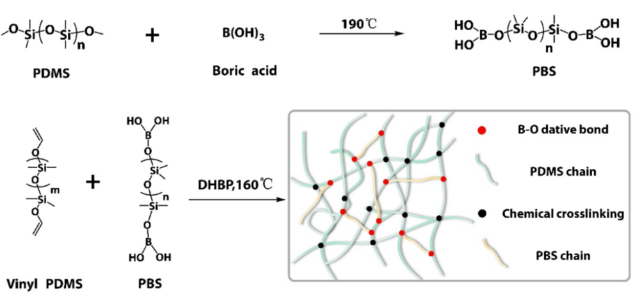 This SLE system was prepared by mixing boronic acid-terminated short-chain polydimethylsiloxane (PBS), vinyl-terminated PDMS, and a thermal crosslinking agent (DHBP), followed by hot pressing to trigger the crosslinking of Vinyl PDMS. As illustrated above [1], the resulting elastomers were labelled SLE-1, SLE-2, and SLE-3, based on the mass ratio of PBS to Vinyl PDMS (e.g., 1:1 in SLE-1), along with a fully crosslinked PDMS control sample.