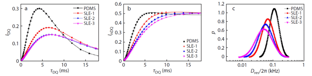 To investigate the effect of dynamic bond content on internal structure, the authors first employed proton multiple-quantum nuclear magnetic resonance (1H MQ NMR) to assess network homogeneity. Dipolar couplings are commonly used for structural analysis, but in flexible or solution-phase systems, these couplings are averaged out by molecular motion. In constrained polymer networks, however, dipolar couplings persist due to limited chain mobility, allowing for detection via specific pulse sequences that excite double-quantum coherence. As excitation time increases, the DQ signal intensity initially rises and then decays (see below, panel a). Normalised signal fitting (panel b) yields the distribution of residual dipolar couplings Dres (panel c). Dres inversely correlates with segmental molecular weight, so its distribution reflects network homogeneity. For SLE samples, increasing the content of boronic ester-based dynamic bonds led to greater network inhomogeneity. This may be due to coordination between PBS and Vinyl PDMS hindering segmental mobility and thus chemical crosslinking efficiency. Additionally, PBS–PBS interactions via boronic ester condensation may further disrupt structural uniformity.