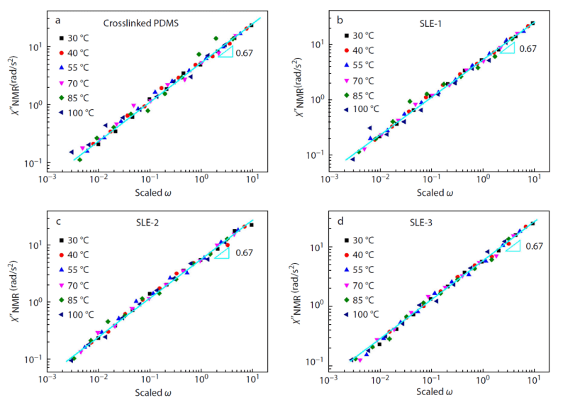 The authors also collaborated with Niumag to employ fast field cycling NMR (0.01–10 MHz 1H FFC NMR) to analyse changes in chain dynamics—specifically Rouse-type bead-spring motion—as dynamic bond content varied. FFC NMR is widely used to probe molecular motion in the kHz–MHz range. Samples were pre-polarised at a high magnetic field and then rapidly switched to different field strengths to measure the spin–lattice relaxation rate R1 (=1/T1). Relaxation in polymers arises from dipolar interactions between protons, modulated by chain motion. By applying the frequency–temperature superposition principle (FTS), the R1 vs. field strength data from 29–100 °C were overlaid into a master curve (shown below), representing the NMR susceptibility spectrum: wR1(w) = k[x”(w) + 2x”(2w)] = kx”NMR(w). Since the test temperatures were well above PDMS’s glass transition (Tg ≈ –70 °C), the slope corresponded to typical Rouse-type dynamics in all samples.