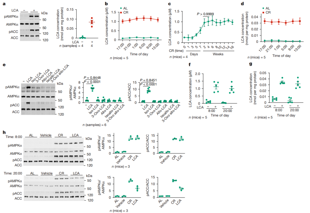 2.1 Figure 2a: After 4 hours of 1μM LCA treatment of MEFs, AMPK activity and intracellular LCA concentration were measured. The results indicated that LCA is the factor in CR serum that activates AMPK, and the intracellular LCA concentration after treatment was similar to the concentration in CR mouse tissues.