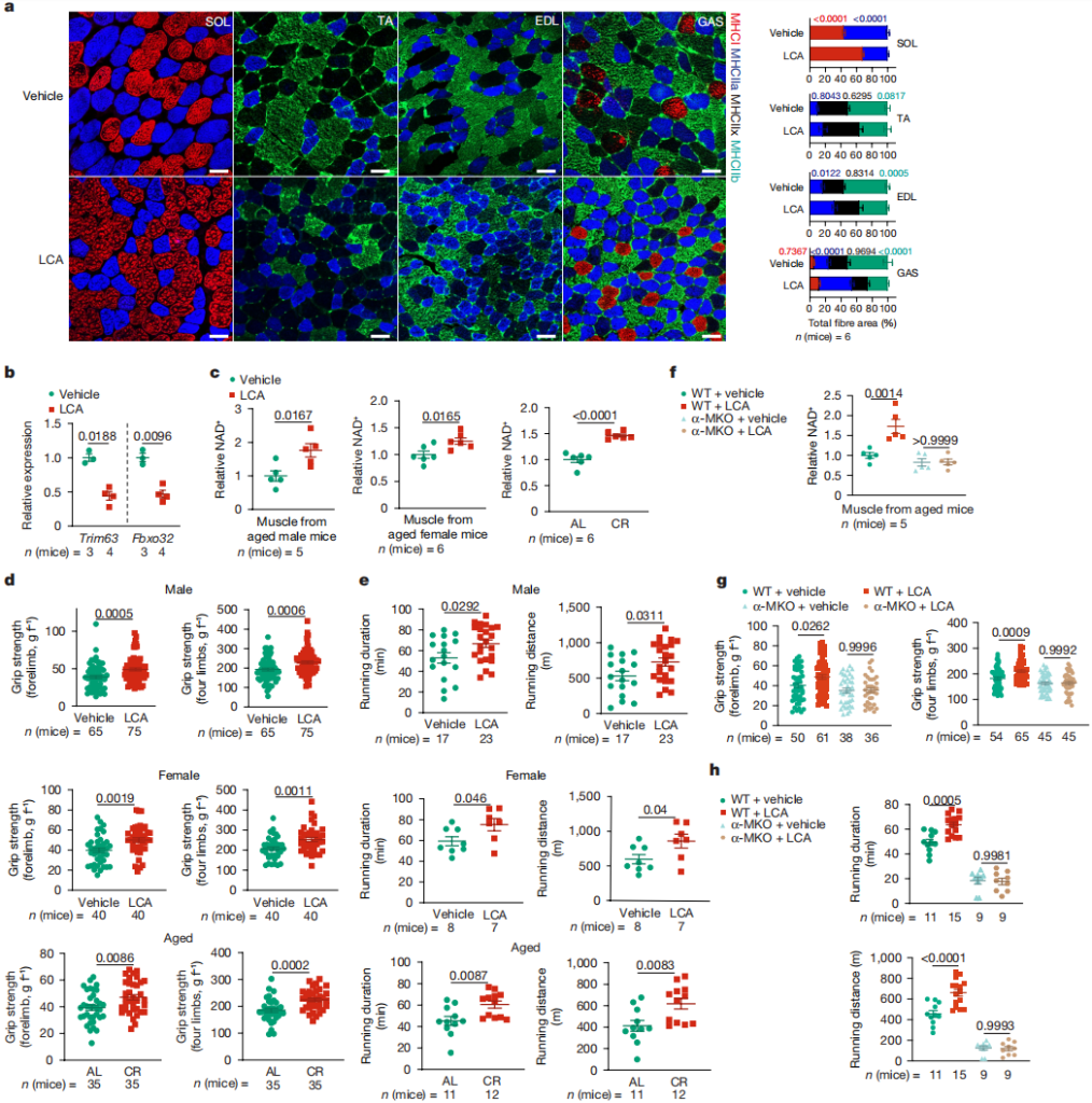 3.2 Figure 3c: NAD⁺ levels in muscle tissue of elderly mice were measured, and it was found that LCA treatment increased NAD⁺ to levels similar to those induced by CR.
