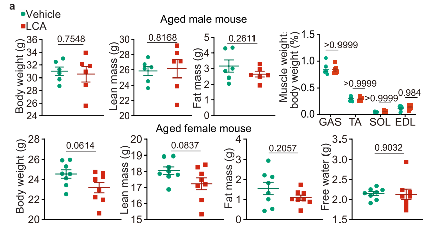 5.1 Figure 5a: LCA prevents muscle atrophy in aged mice: After 1 month of feeding male and female aged mice (2-hydroxypropyl)-β-cyclodextrin-coated LCA (1g/L in drinking water), LCA-treated mice showed a significant trend of maintaining or increasing muscle mass compared to the control group. This suggests that LCA effectively prevents muscle atrophy due to aging in aged mice and has a positive protective effect on muscle health. In addition to muscle mass, data from this analyzer also suggests that LCA treatment might affect fat body mass and overall body weight in mice. Although the paper does not discuss changes in fat body mass and weight in detail, the comprehensive data from body composition measurements suggest that LCA may influence fat accumulation or depletion through some metabolic regulation mechanism, thereby adjusting the fat-to-lean body mass ratio and maintaining the balance of body composition.