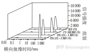 Literature Conclusion: Different thawing methods affect the T2 relaxation times of frozen pork in varying ways. During thawing, water migration occurs between different moisture states. LF-NMR T2 analysis shows significant effects of thawing method on water migration: refrigerated thawing promotes the shift from immobilized to free water; microwave thawing (method 1) tends to shift free water to immobilized water, while microwave thawing (method 2) favors migration from immobilized to bound water.