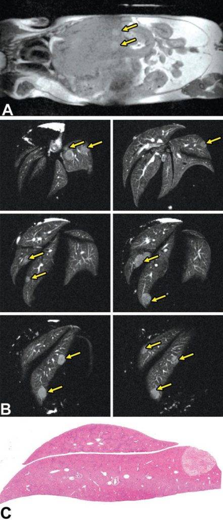In vivo MRI detected focal liver injury in a mouse model (Fig. A). High-resolution ex vivo MRH identified several distinct focal fatty lesions in the liver (Fig. B and C). Routine histopathology confirmed these lesions as focal fatty changes (Fig. C).