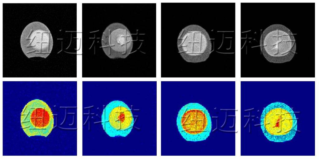 In T1-weighted imaging, long relaxation signals are suppressed, making shorter T2 signals appear brighter (or redder in pseudocolor images). This may indicate that some proteins in the salted yolk are precipitated by salting, leading to shorter relaxation times of bound water—displayed as a bright elliptical area in the image.