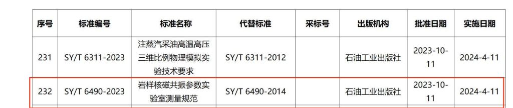 On October 11, 2023, the National Energy Administration released the “Petroleum and Natural Gas Industry Standards of the People’s Republic of China,” which will come into effect on April 11, 2024. Among these standards, the “Rock Sample NMR Parameter Laboratory Measurement Specification” clearly defines the main measuring instruments, reagents preparation, rock sample preparation, rock sample measurement, result processing, and allowable uncertainty requirements for laboratory measurement of rock sample NMR parameters. This specification applies to the measurement of NMR parameters in rock samples or rock debris.